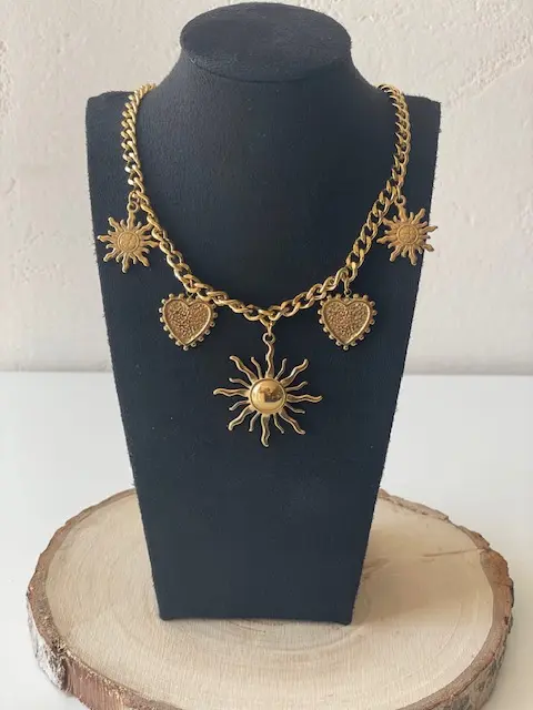 Ce collier soleils et cœurs n’est pas un bijou ordinaire. Sa chaîne épaisse, son design généreux et ses pendentifs symboliques en font une pièce à fort caractère, pensée pour celles qui aiment s’exprimer à travers leurs accessoires. Trois soleils rayonnants et deux cœurs finement ciselés se déploient le long de la chaîne, créant un jeu de reflets et de profondeur qui capte instantanément le regard.