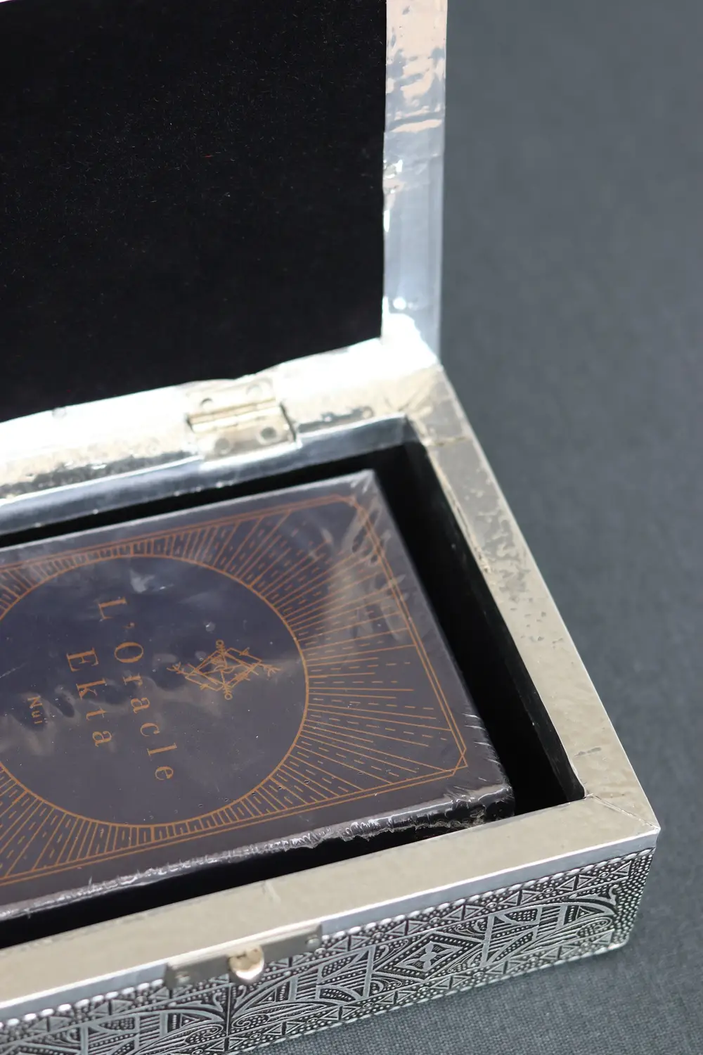 Boîte de rangement attrape-rêves en bois, recouverte de feuilles d’aluminium gaufrées.