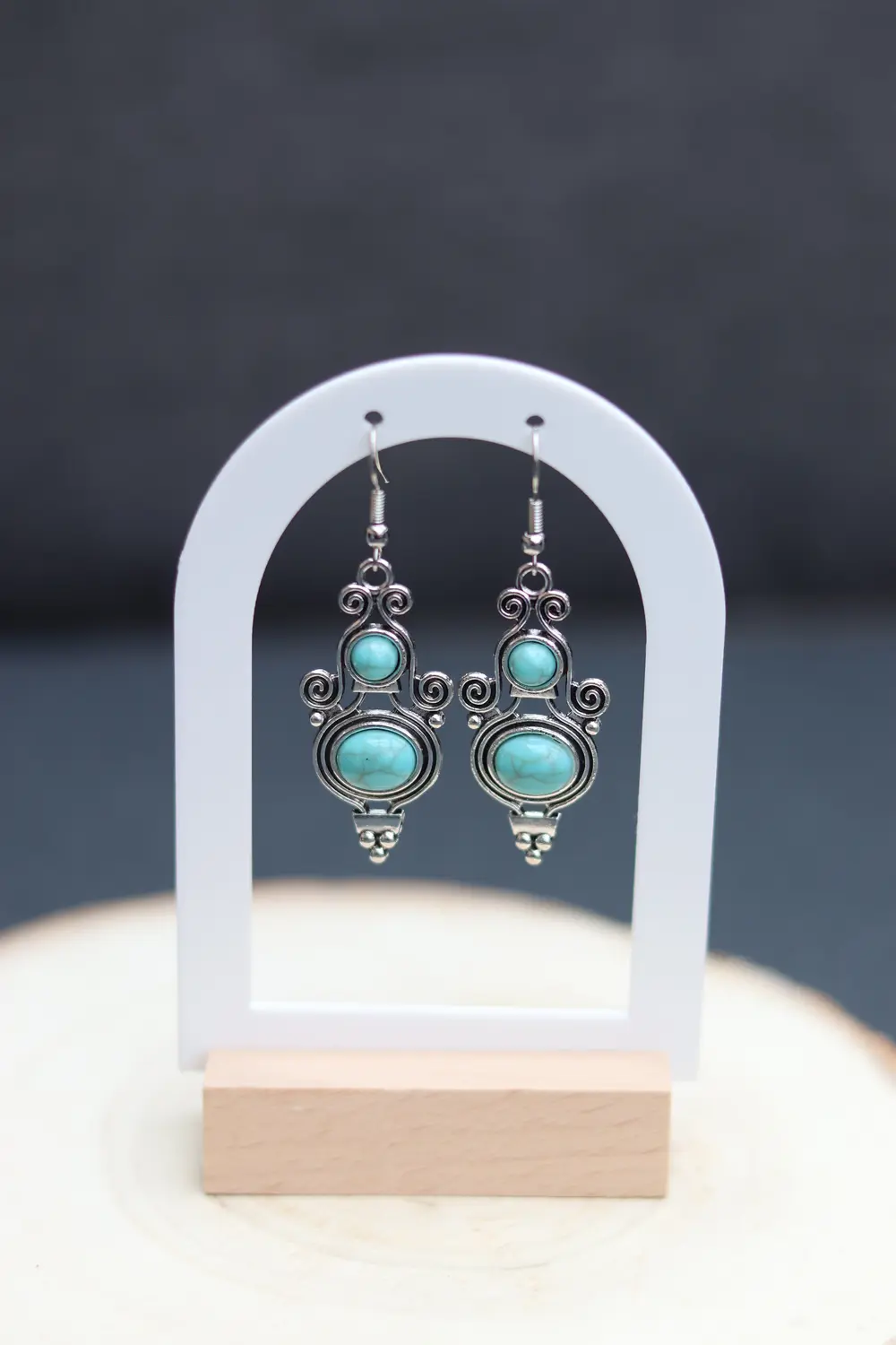 Boucles d’oreilles en acier inoxydable ornées de spirales et de deux pierres turquoises.