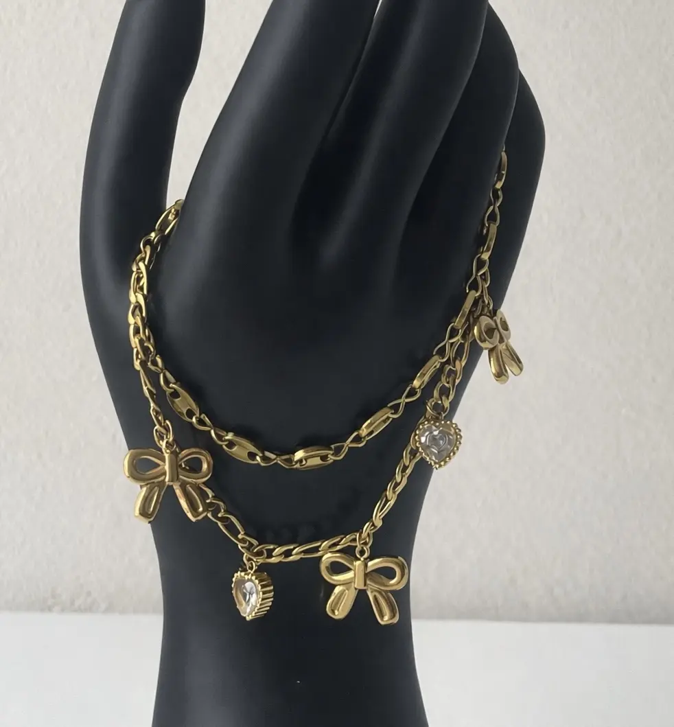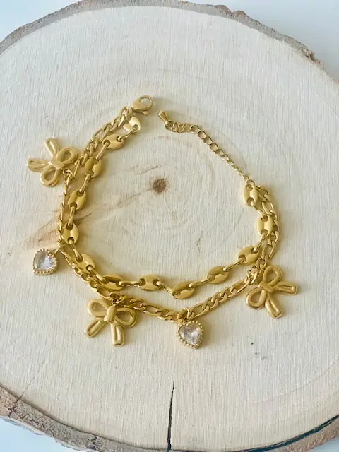 Ce bracelet double chaîne doré s’impose comme la pièce maîtresse de la collection printemps-été 2026. Deux rangs de chaîne en acier inoxydable doré se conjuguent harmonieusement, rehaussés de charms nœuds et cœurs en strass qui insufflent romantisme et caractère à chaque poignet.