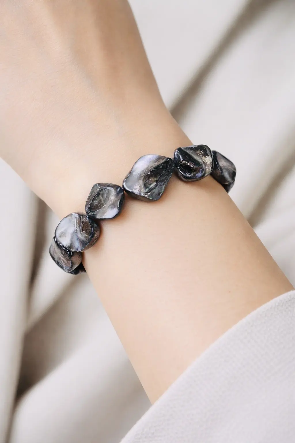 Ce bracelet en pierres de nacre gris-bleu est bien plus qu’un simple accessoire. C’est un bijou naturel, apaisant et intemporel, qui allie la beauté irisée de la nacre véritable à une teinte gris-bleu profonde et élégante, évocatrice des horizons marins et de la quiétude des eaux calmes.