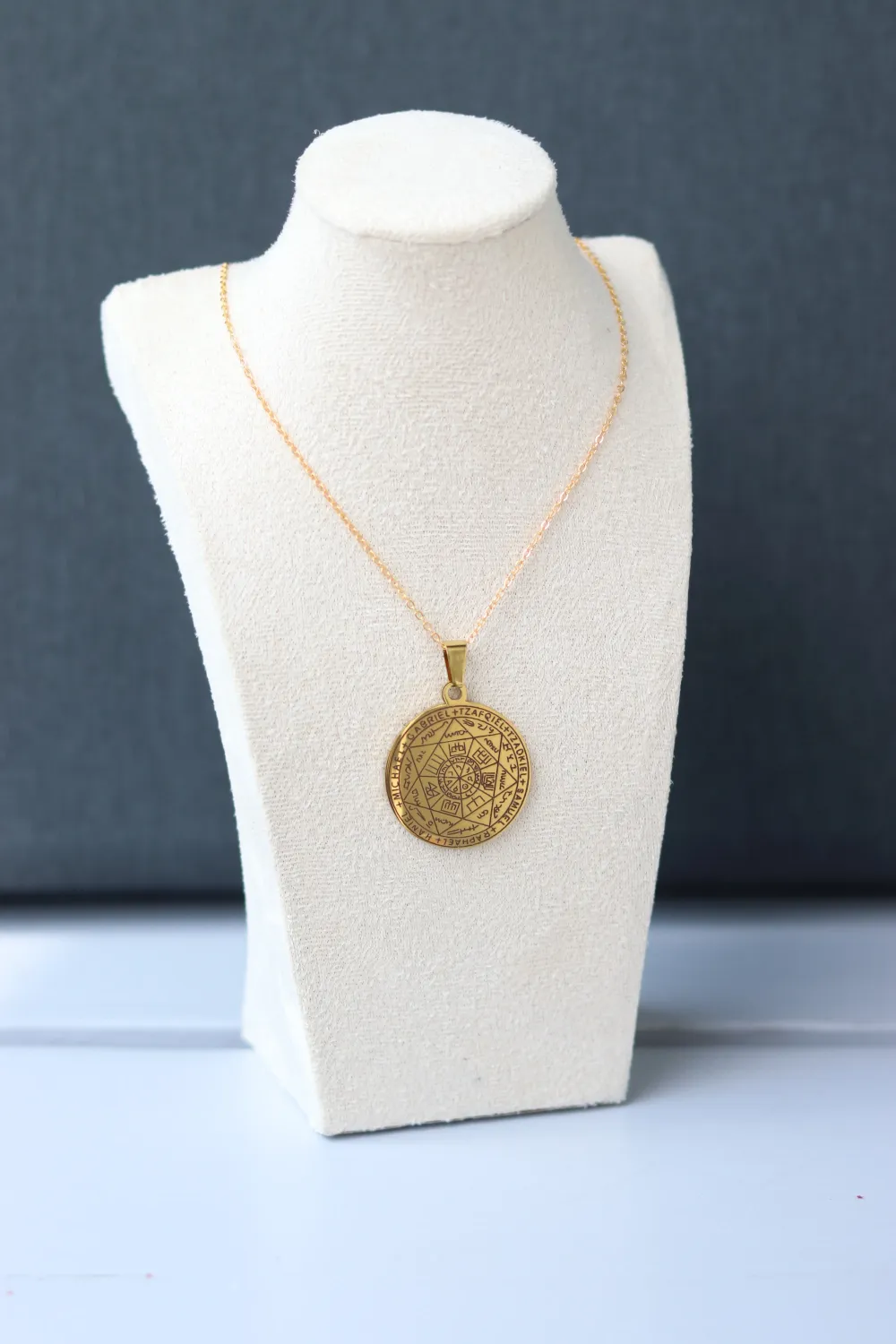 Le pendentif réunit les noms des sept Archanges majeurs associés aux planètes classiques et aux éléments.