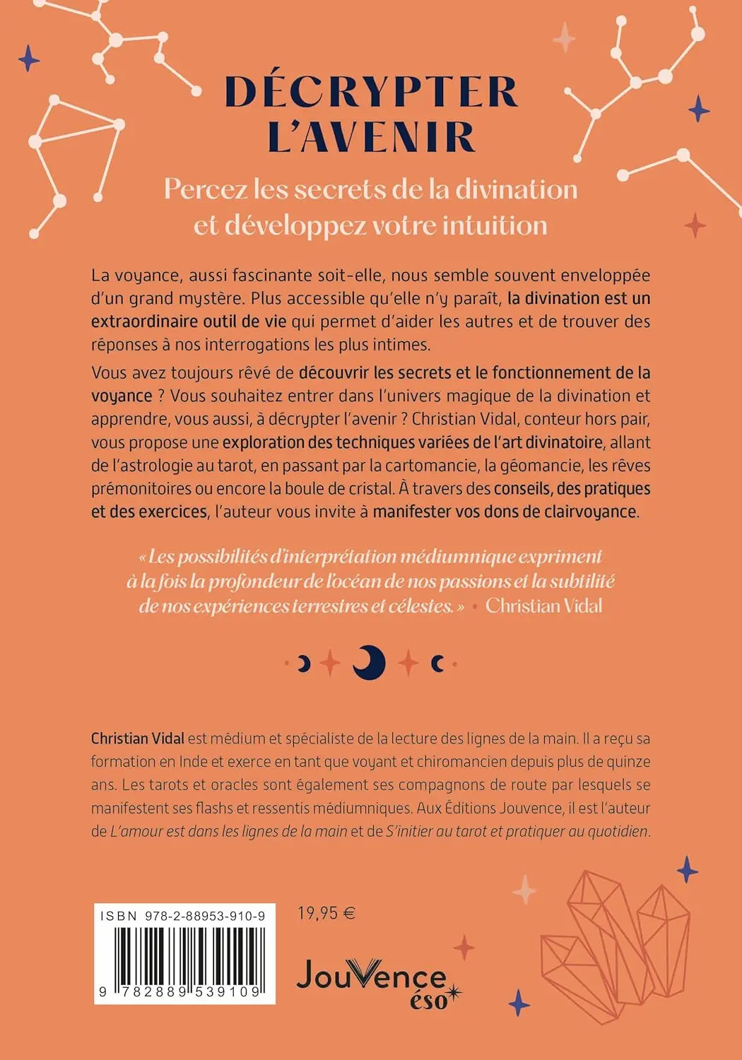 Vous avez toujours rêvé de découvrir les secrets et le fonctionnement de la voyance ? Vous souhaitez entrer dans l’univers magique de la divination et apprendre, vous aussi, à décrypter l’avenir ? Christian Vidal, conteur hors pair, vous propose une exploration des techniques variées de l’art divinatoire, allant de l’astrologie au tarot, en passant par la cartomancie, la géomancie, les rêves prémonitoires ou encore la boule de cristal. À travers des conseils, des pratiques et des exercices, l’auteur vous invite à manifester vos dons de clairvoyance.