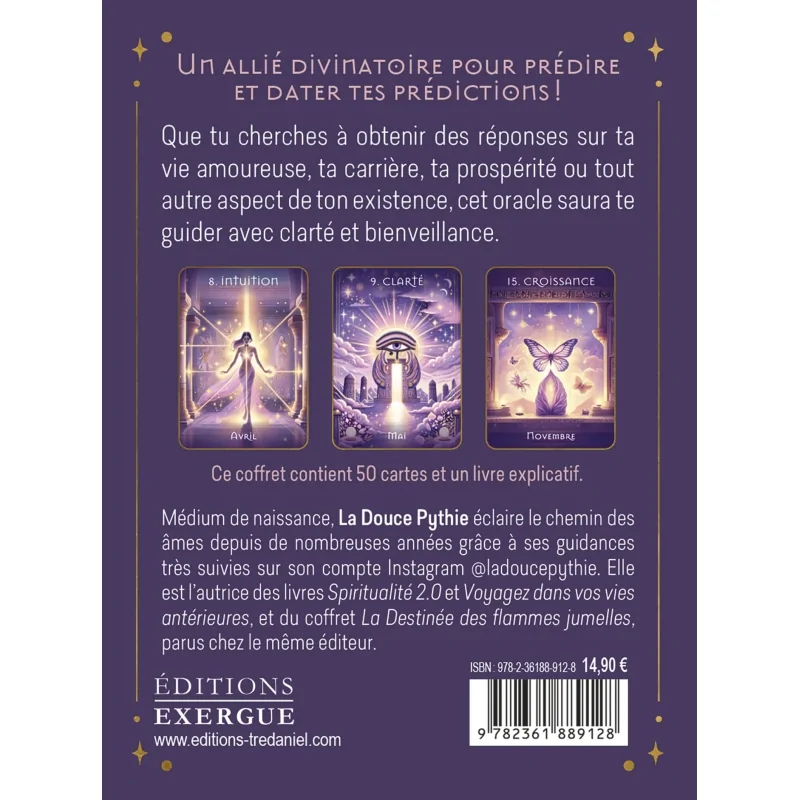 Le Pocket Oracle des Prédictions est un jeu de cartes divinatoires conçu pour vous accompagner au quotidien dans vos questionnements et décisions. Grâce à ses 50 cartes illustrées et son livret explicatif, ce coffret vous offre une guidance claire, rapide et accessible. Il est pensé pour répondre précisément à vos interrogations, avec des messages datés pour vous aider à mieux vous situer dans le temps et à anticiper les événements importants de votre vie.