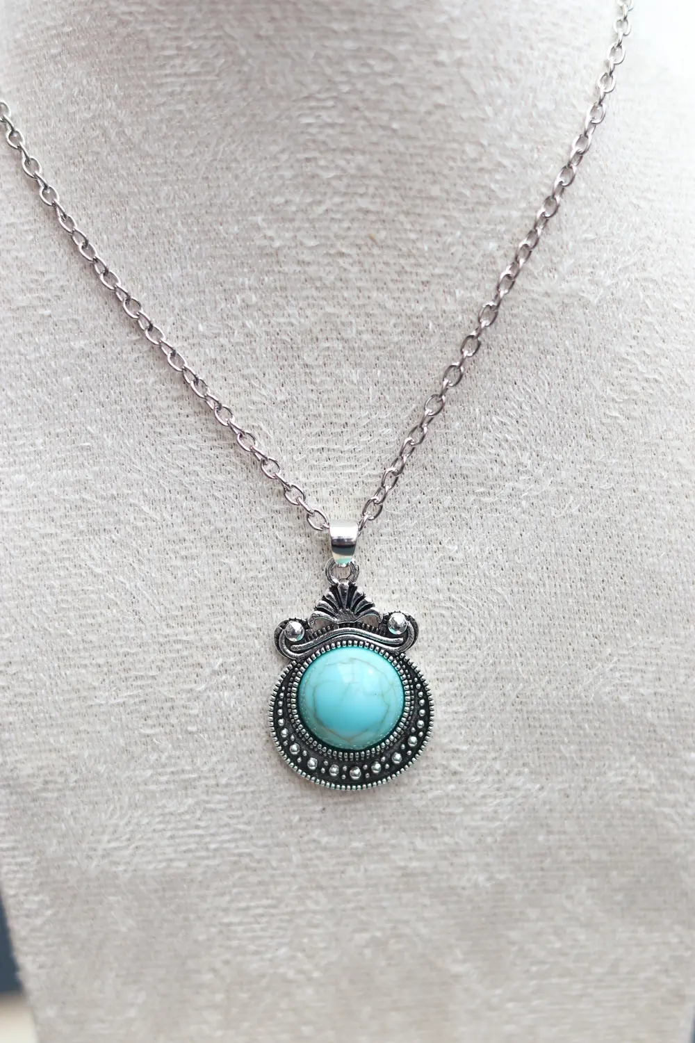 Pendentif : forme ronde ornée de motifs spirales ethniques noirs. En son centre, une pierre de couleur turquoise ovale lisse.