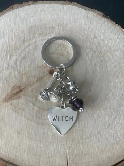 Un charmant porte-clés orné d’un cœur et entouré de petites breloques (balai de sorcière, chaudron…). Un clin d’œil aux traditions magiques.